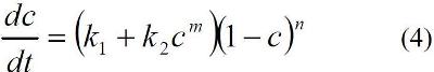 where m and n are the reaction orders, c is the extent of the vulcanization reaction, defined by c = Q/QT , and k1 and k2 are the Arhenius overall constants defined by,
