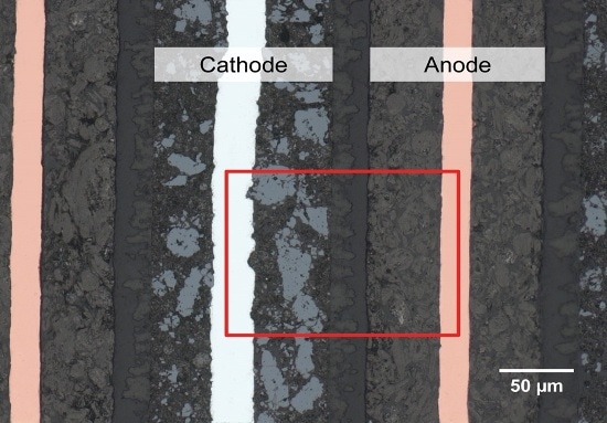 The above figure shows a brightfield LM image of the layer structure inside an aged Li-ion battery. Anode and cathode are layered in alternate fashion, each with a separator in the middle. The anode includes a copper collector with graphite, while the cathode has an aluminum collector covered by lithium metal oxide material. Aging effects can be noted within the separator, wherein a layer grows from the cathode into the separator.