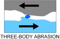 - Three-body wear – This is an abrasive wear form in which wear occurs due to loose particles generated of introduced between the contacting surfaces.