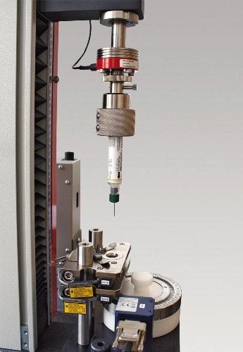 Figure 1. A zwicki-Line system engaged in characterization of an injection device. Specialized fixturing holds the specimen in position for a variety of different tests in accordance with customer requirements.