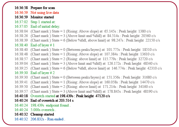 The Chart Marker graph shows the End Point progress, and the Events Log timestamps, state changes, and key count rates, just like in a live data acquisition. With the EP-Replayer, users can experiment with various End Point techniques and more sophisticated recipe template features while using fewer wafers to create a more reliable, repeatable, and economical etch process.