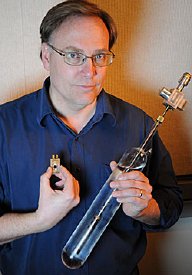 NIST physicist Samuel Benz holds the two components that are compared in the first electronic measurement of the Boltzmann constant. The ac reference signal generated by the superconducting chip (left) is compared to the "Johnson noise" of a resistor inside the glass container (right). In the experiment, the water in the container is held at its triple point temperature near 0° C or 32° F.