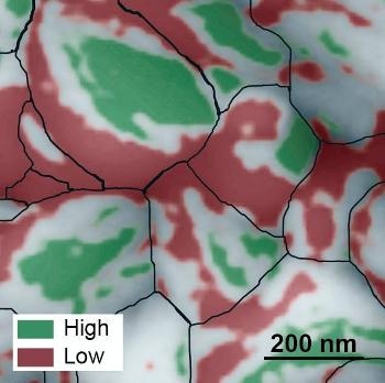 This atomic force microscopy image of the grainy surface of a perovskite solar cell reveals a new path to much greater efficiency. Individual grains are outlined in black, low-performing facets are red, and high-performing facets are green. A big jump in efficiency could possibly be obtained if the material can be grown so that more high-performing facets develop. (Credit: Berkeley Lab)