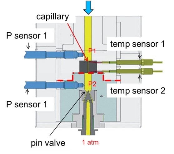 In 2014, Moldex3D Material Characterization Laboratory attained an exclusive U.S. patent on pressure dependency viscosity model and CAE simulation. Through a capillary rheometer (Fig. 1), users can obtain the viscosity property data before running a CAE analysis. The changes of viscosity under different pressures can be measured (Fig. 2) by controlling the opening levels of the valve at the capillary’s exit and applying different back pressures. Two common viscosity models are shown in Fig. 3. The “D” in Modified Cross Model (2) and “D3” in Modified Cross Model (3) are the pressure dependent coefficients. A higher D or D3 value means the viscosity will dramatically increase with higher pressure. According to the viscosity values (Fig. 2) measured by the capillary rheometer under different pressures, the pressure dependent coefficients in the viscosity models as well as the extrapolated viscosity under zero pressure can be obtained. In addition, the theoretical model of pressure-viscosity effect can be referred to U.S. Patent 8,768,662 B2 (Ref. 1).