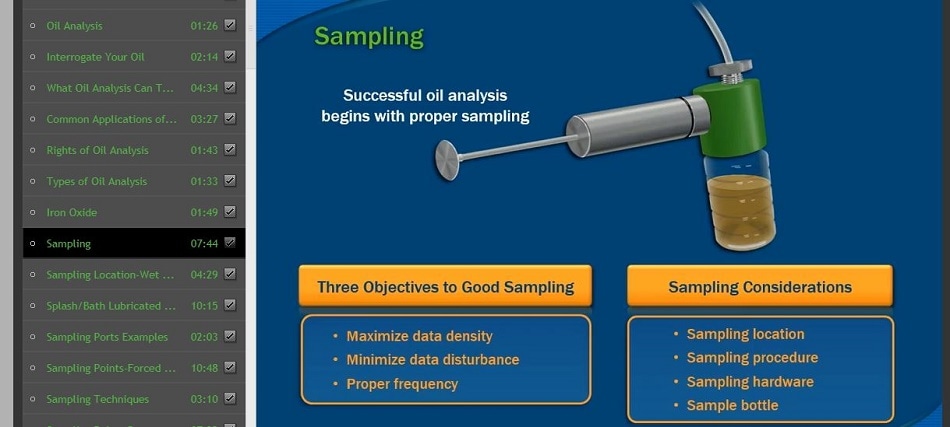Oil Analysis Fundamentals is an online training class that defines oil-sampling frequencies, describes sampling methods and equipment retrofitting, and summarizes basic oil analysis techniques. The course also discusses lubricant care and maintenance including contamination control techniques, lube room storage and management, and ways to keep lubricants cool, dry and clean and thereby maximize performance and extend lubricant life.