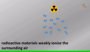 Since decay particles are produced by radioactive material, electrons from nearby atoms are stripped or ionized by the particles, ultimately producing a tiny number of free electrons that rapidly adhere to oxygen molecules.
