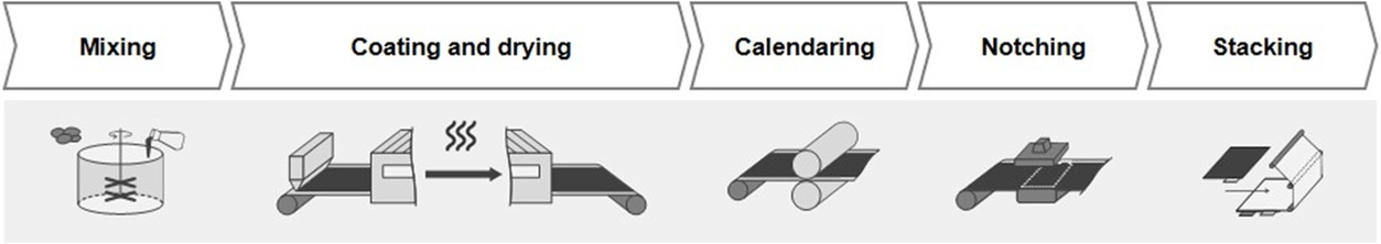 ![Schematic view of the steps in electrode production.[30] The first step in electrode manufacturing is slurry mixing where the raw active material is mixed with binder, solvent, and other additives. Coating and drying is the process of dispersing the slurry onto the aluminum (cathode) and copper (anode) metal foils and drying the coated material to evaporate the solvents. In the calendering step, the coated material is pressed onto the metal foil to provide the consistent thickness, porosity, and adhesion. Notching cuts the calendared electrodes into the right shape. Notching is the step in which individual electrode sheets are cut out of the electrode coil.](https://www.azom.com/images/news/ImageForNews_60251_16660007971466313.png)