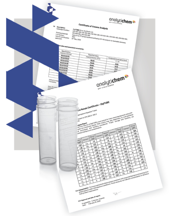 The Trace Metals Certificate details reference values for any inherent trace metal background associated with the polypropylene materials used in DigiTUBEs. These transparent, method-based reference values can support method validation, blank evaluation and audit documentation. This is crucial when measuring trace elements down to ppb or ppt levels using extremely sensitive analytical techniques, such as ICP-OES and ICP-MS.