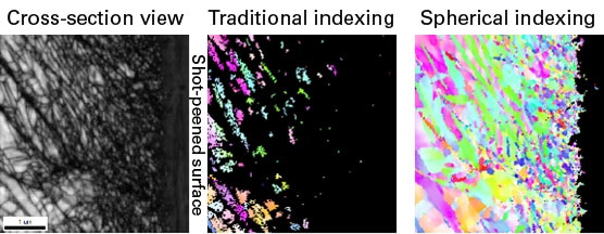 Figure 4. Spherical indexing improvements on a shot-peened titanium alloy. The increased colored orientation measurements and reduction of black non-indexed points with spherical indexing compared to traditional indexing shows where orientations can now be reliably measured. Image Credit: Mr. Prathompoom Newyawong, NSTDA Characterization and Testing Service Center.